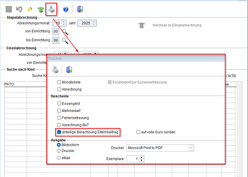 In der Abrechnung kann eine tagegenaue anteilige Berechnung des Elternbeitrages nach Anwesenheitstagen als Stapelabrechnung erfolgen.